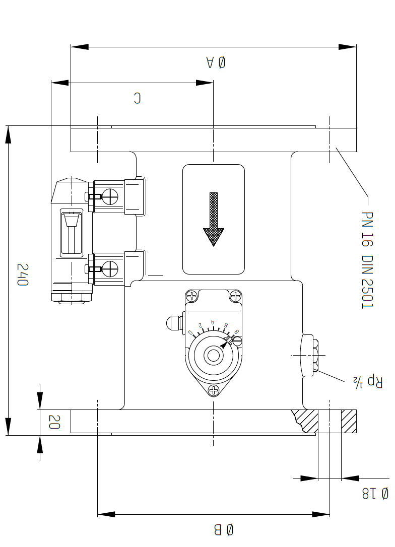 DN | NRF NR. | ART. NR. | MEASSURING RANGE L/MIN. | A mm | B mm | C mm | VEKT kg | TRYKK KLASSE |